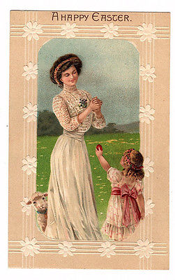 Title (ebay affiliate link): Easter~Beautiful Woman, Pretty Child & Lamb Gather Eggs Early German Postcard
