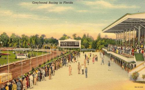 c1940 - Watching the track at the Greyhound Races in Florida - Vintage Postcard
