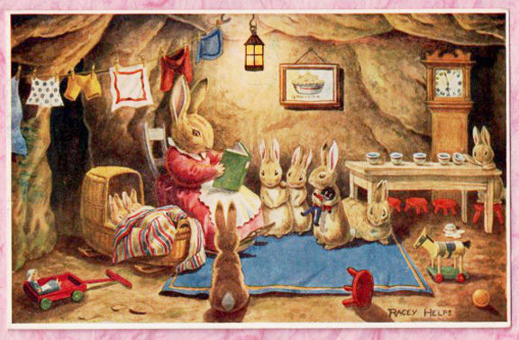 Title (ebay affiliate link): A/S RACEY HELPS ~ DRESSED RABBITS Baby Bunnies BEDTIME STORY Black Rag Doll PC