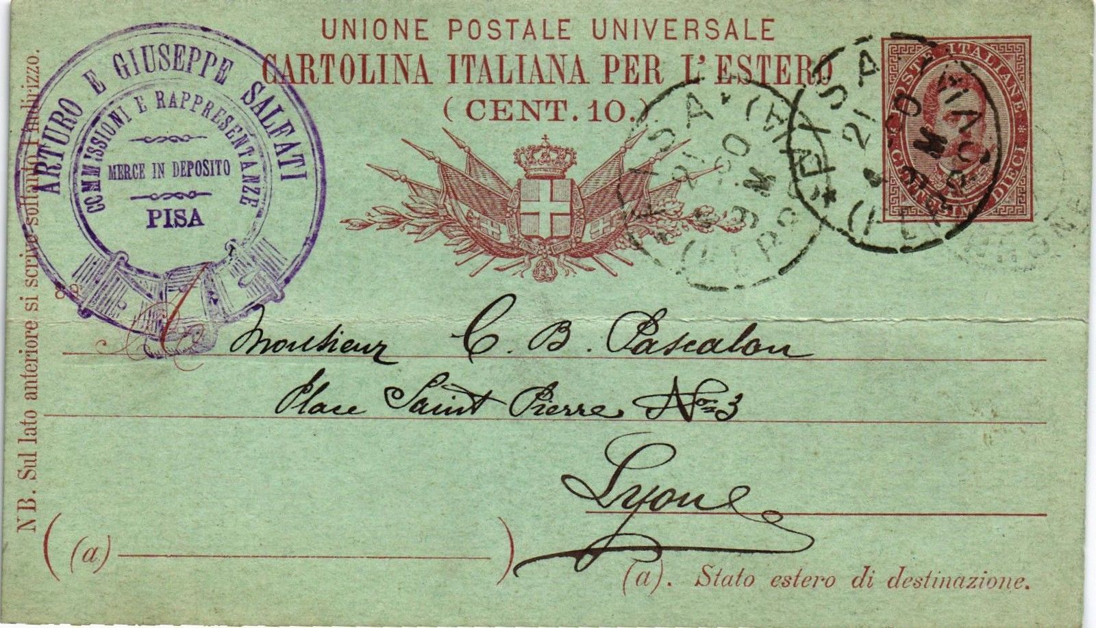 DR JIM STAMPS OLD UPU PISA ITALY POSTAL CARD 1890