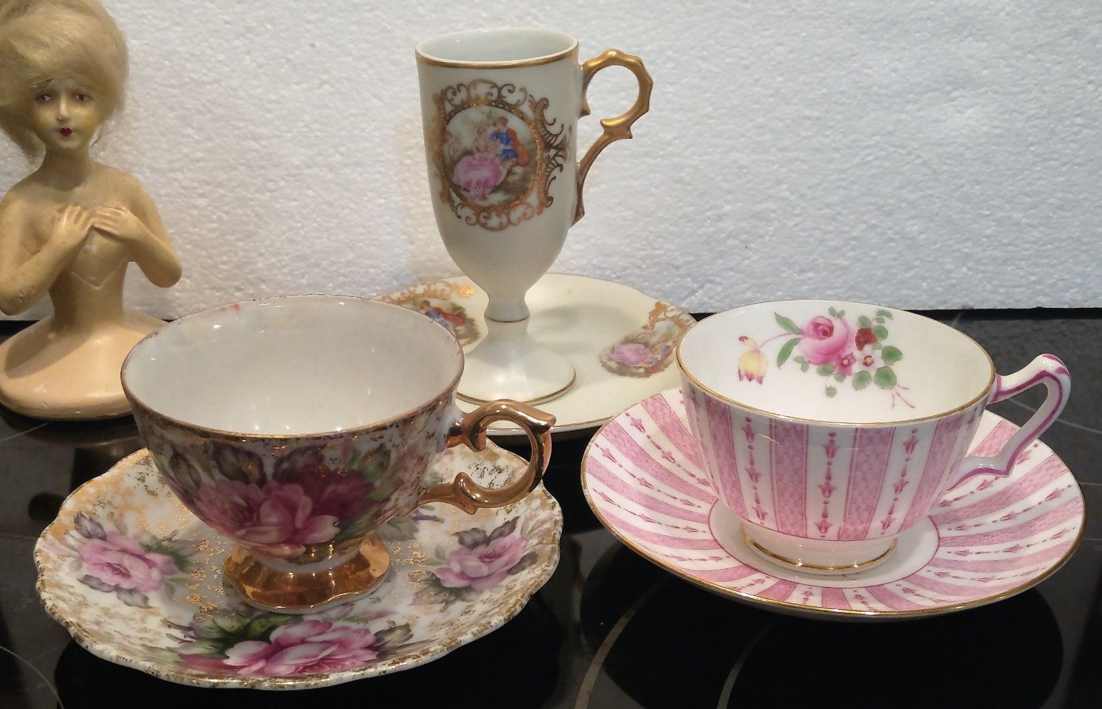 3 Mismatch Teacup Saucer LOT SET figural portrait PINK Roses NICE!