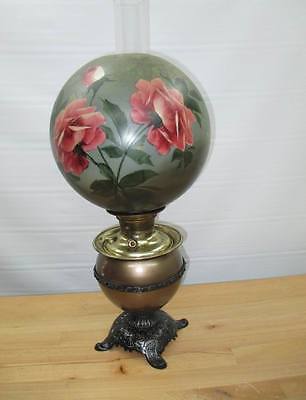 c1800s MILLER JUNO #2 BURNER OIL LAMP AND PAINTED GLOBE WORKS
