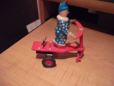 WIND UP TIN CLOWN ON SCOOTER WORKS VINTAGE