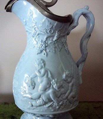 UNUSUAL ENGLISH POWDER BLUE GLAZED CERAMIC SYRUP JUG PEWTER LID CHERUBS