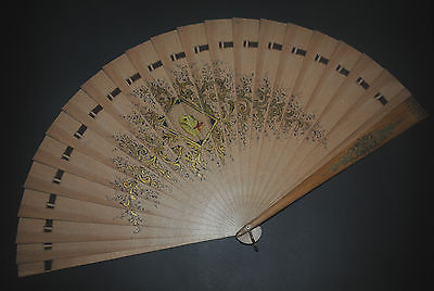 LARGE ANTIQUE VICTORIAN CARVED WOOD GOLD GILT PAINTED DOG PORTRAIT BRISE FAN
