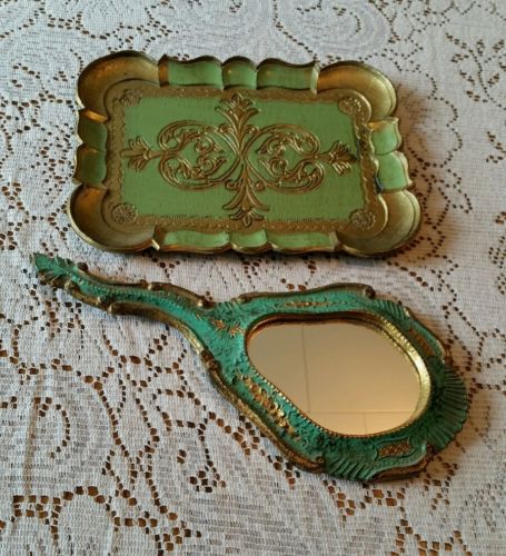 Title (ebay affiliate link): 2 Vintage Florentine Vanity Items Tray & Hand Mirror Gold Green Italy wood Gesso