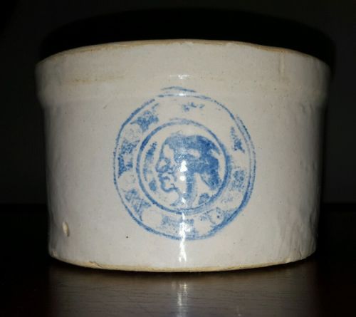 ATQ Stoneware Louisville Indian Head Blue SlTQ Salt Glazed Butter Crock
