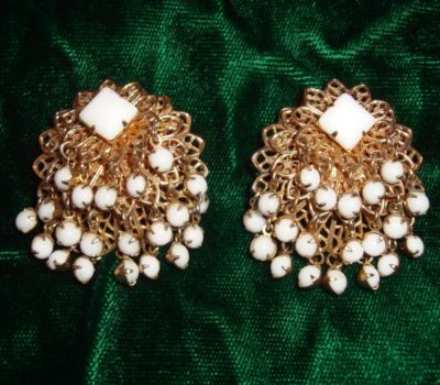 Vintage Milk Glass Dangles Filigree Clip On Earrings