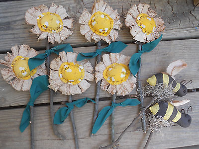 Primitive Grungy White Flower & Bumble Bee Pokes Crock Fillers Decor Set Of 8