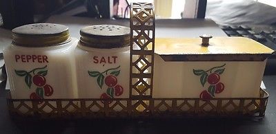 TIPP CITY milk glass CHERRIES range set GREASE jar SALT PEPPER shakers RACK