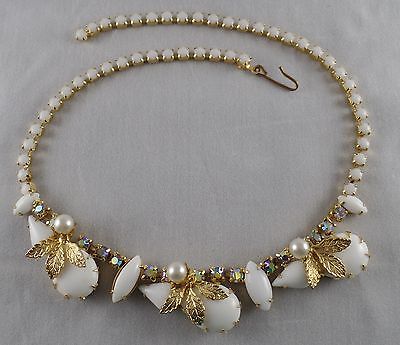 Title (ebay affiliate link): VINTAGE UNSIGNED NECKLACE PRONG-SET MILK GLASS & AURORA BOREALIS RHINESTONES