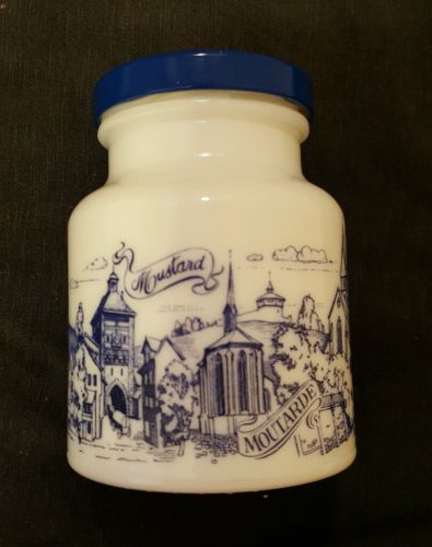 Title (ebay affiliate link): Vintage German Mustard Jar Esslingen Hengstenberg Moutarde Blue White Milk Glass