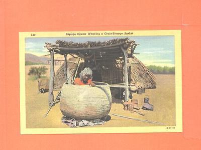 O POSTCARD PAPAGO SQUAW WEAVING A GRAIN STORAGE BASKET WOMAN AT WORK VINTAGE