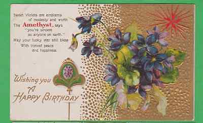 Birthday greetings/embossed postcard/ Amethyst/ violets / star/poem/gilded/pc