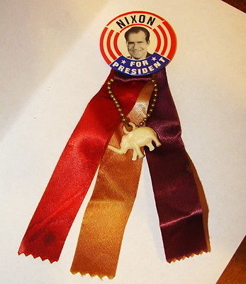 Title (ebay affiliate link): Original 1960's Nixon For President Metal Pin-Back Button W/Ribbon & Elephant