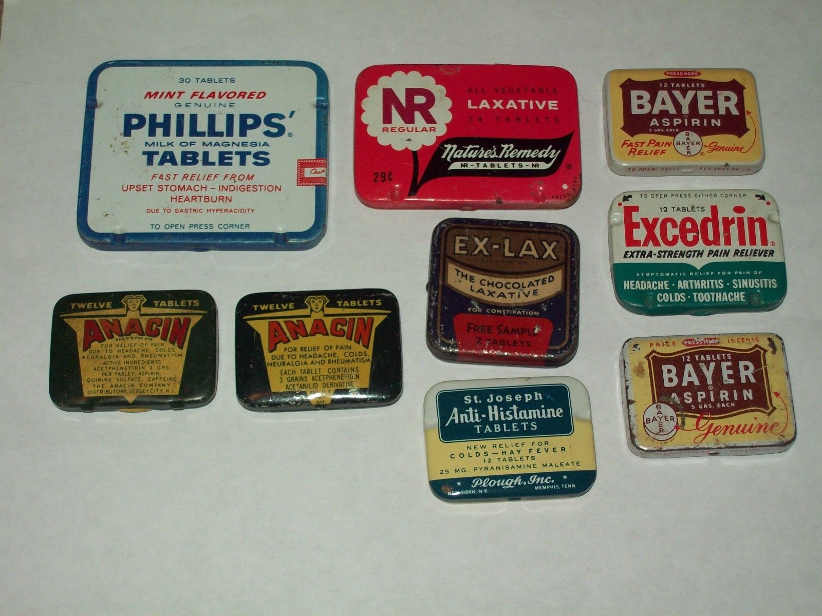 Title (ebay affiliate link): Vintage-Advertising-Craft-ASPIRIN-LAXATIVE-MEDICINE-Tin-Lot-of 9-Empty-VERY POOR