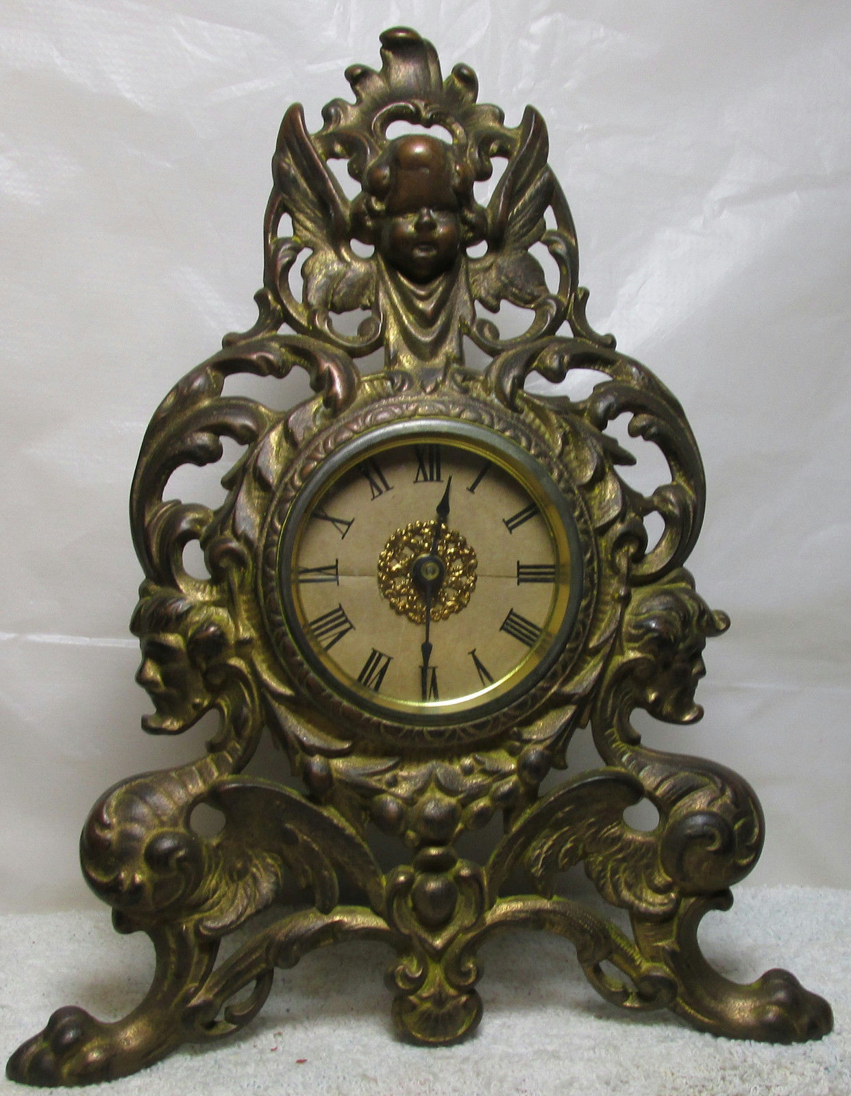 Title (ebay affiliate link): ANTIQUE WIND UP CLOCK WITH AWESOME CAST IRON FRAME AND CHERUB ON TOP - MUST SEE