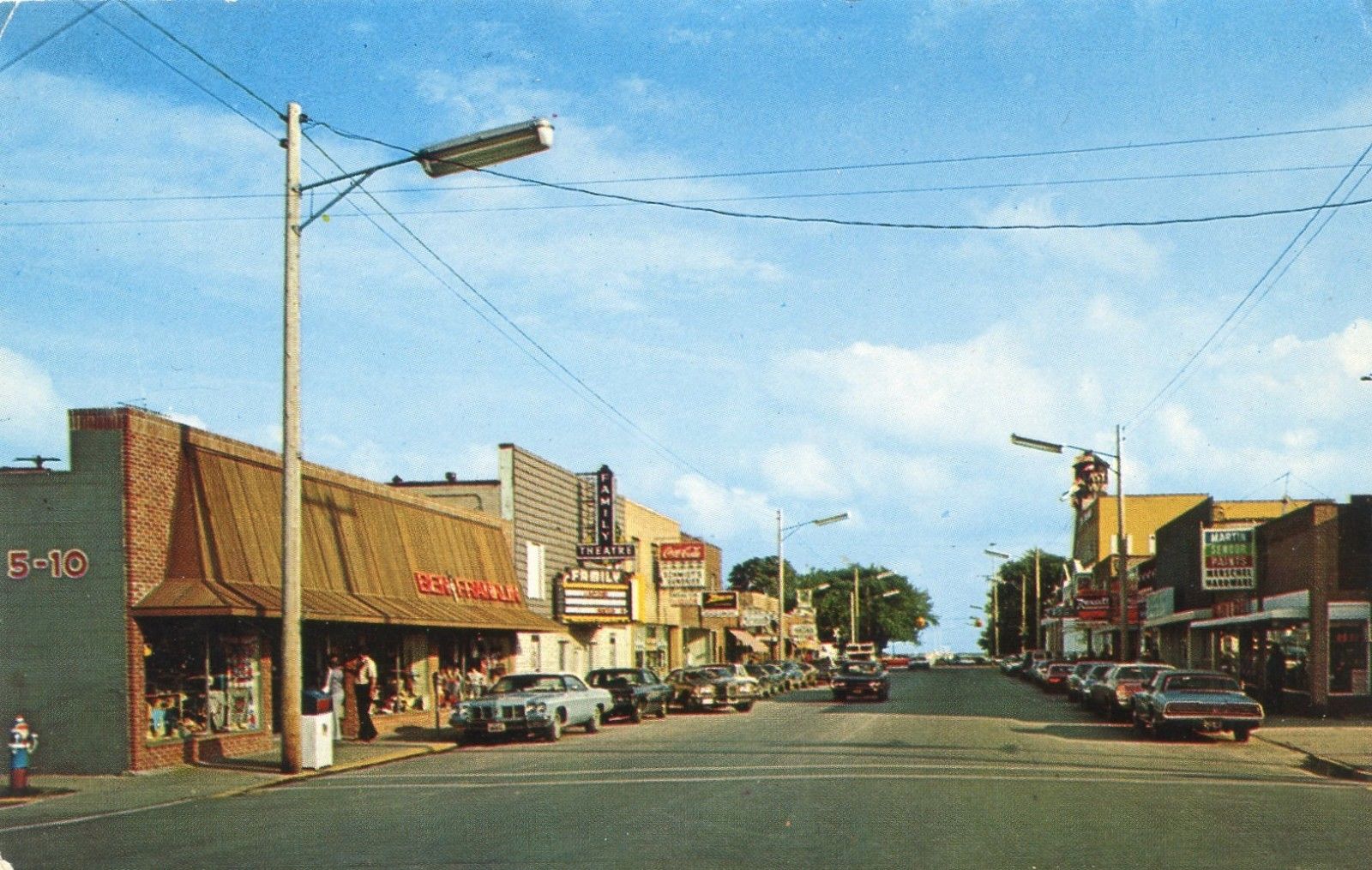 East Tawas Michigan postcard, lots of cars, Downtown, US Hwy. 23, Theatre, Coke