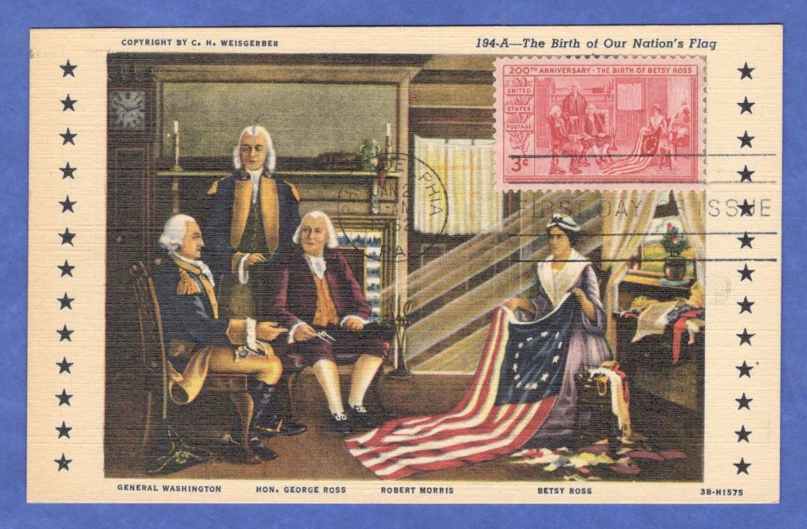 Title (ebay affiliate link): Betsy Ross The Birth Of Our Nation's Flag Linen Finish FDC Maximum Postcard 1952