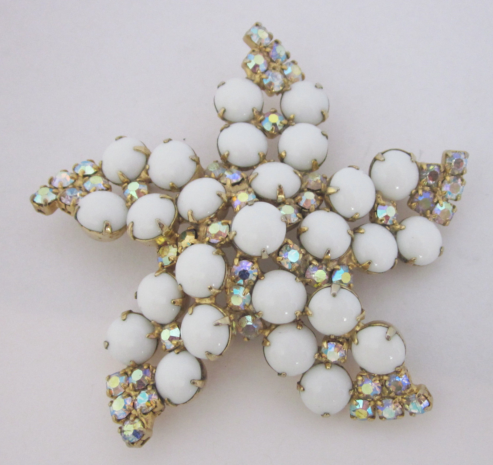 Vintage Crystal Rhinestone/Milk Glass Cabochon Brooch