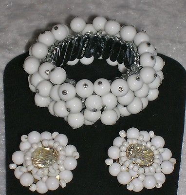 Title (ebay affiliate link): Vintage JAPAN Milk Glass Beaded Expansion Bracelet & Milk Glass Clip Earrings