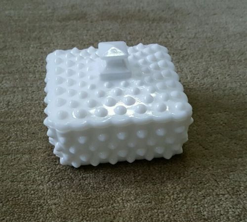 Title (ebay affiliate link): Vintage Fenton Milk Glass Hobnail Design 4" Square Dish w/ Lid & Scalloped Edges