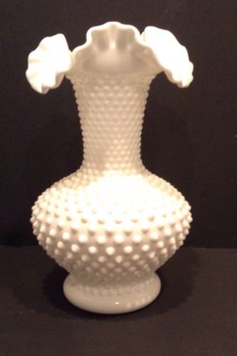 White Milk Glass Hobnail FENTON 10.5" Double Ruffled Vase