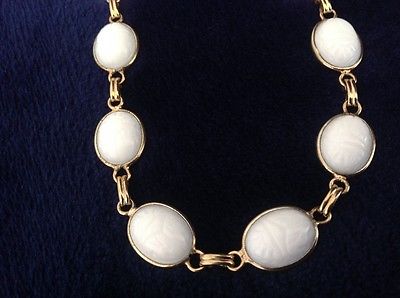 Vintage White Milk Glass Etched Scarab Gold Tone 16" Necklace