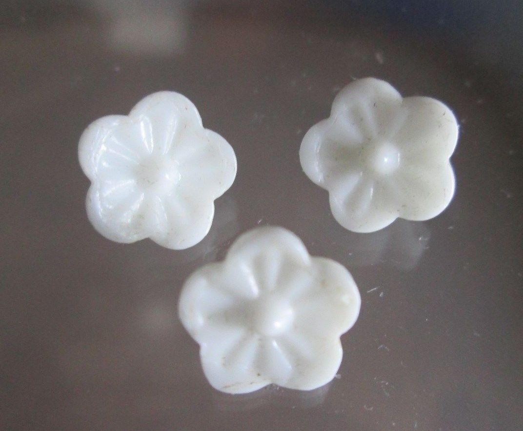 ANTIQUE DIMINUTIVE WHITE MILK GLASS FLOWERS DOLL OR BABY BUTTONS - SET OF 3