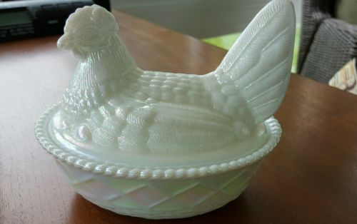 Title (ebay affiliate link): Westmoreland, Hen On Nest, Iridescent White Milk Glass, 5 1/4"