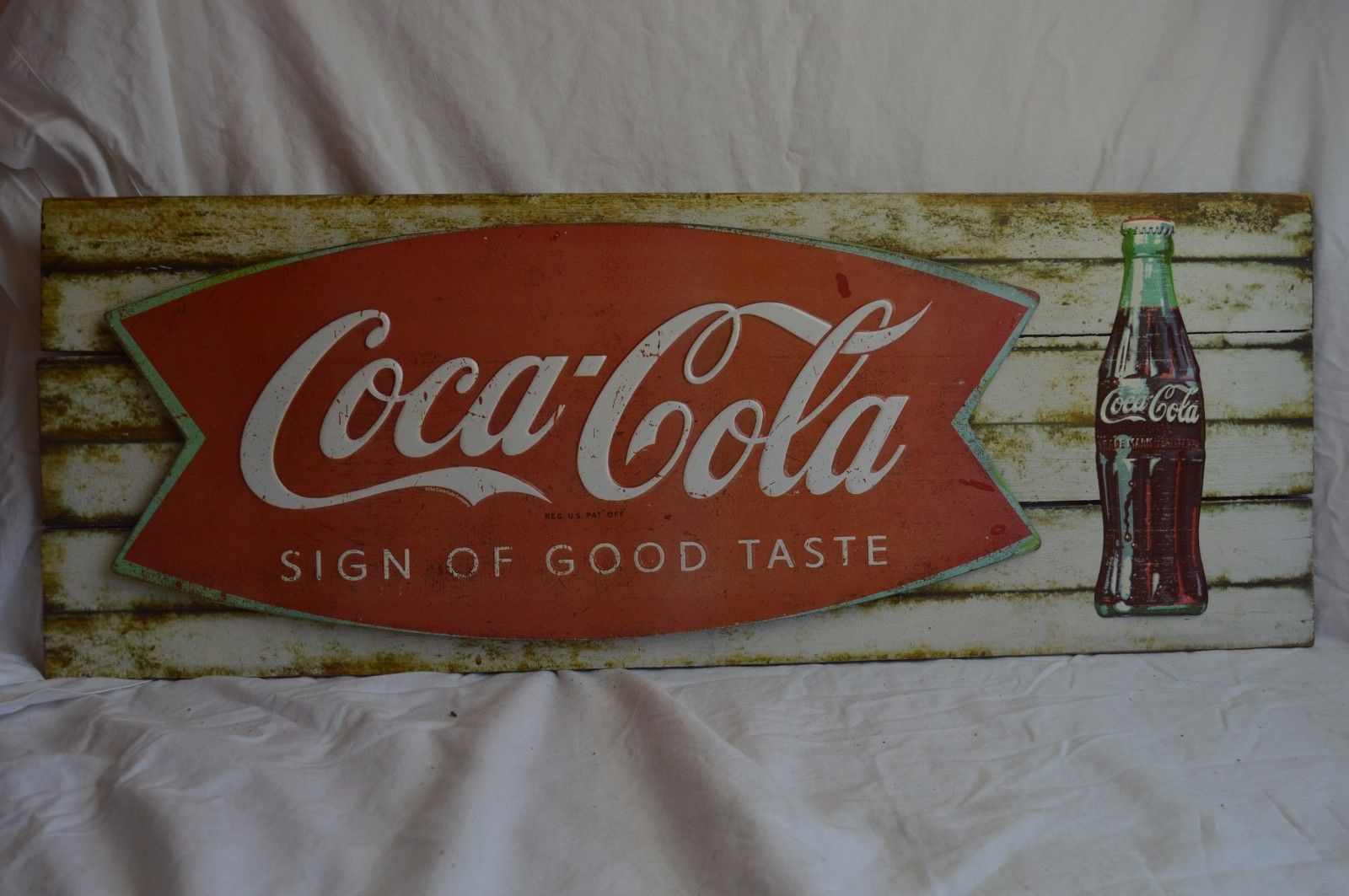 Title (ebay affiliate link): VINTAGE COCA COLA FISHTAIL METAL SIGN COKE BOTTLE GOOD TASTE WOOD ADVERTISING