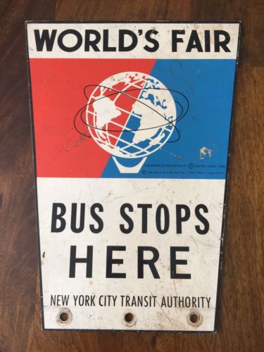Title (ebay affiliate link): Original 1964 New York Worlds Fair BUS STOPS HERE - SIGN - NYC Transit Authority