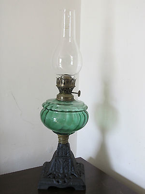 Very Nice Victorian Oil Lamp With Green Glass Bowl + Chimney 43cms tall complete