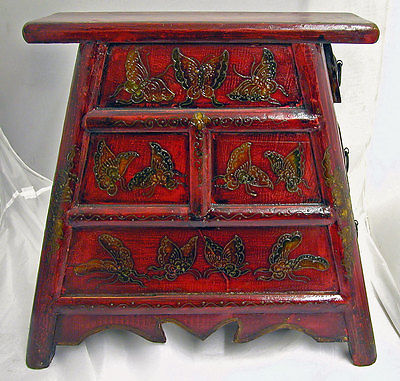 Tibetan Red Butterfly Wooden Stool with Drawers