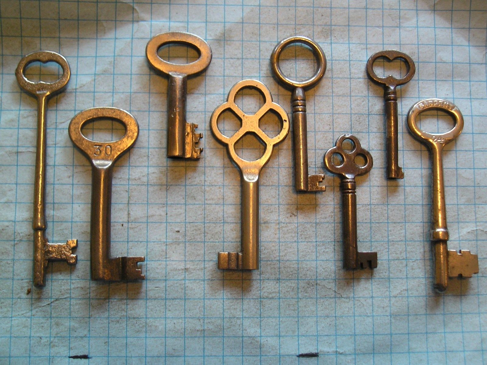 8 ANTIQUE OLD SKELETON, FURNITURE, BARREL, CABINET AND LOCK KEYS