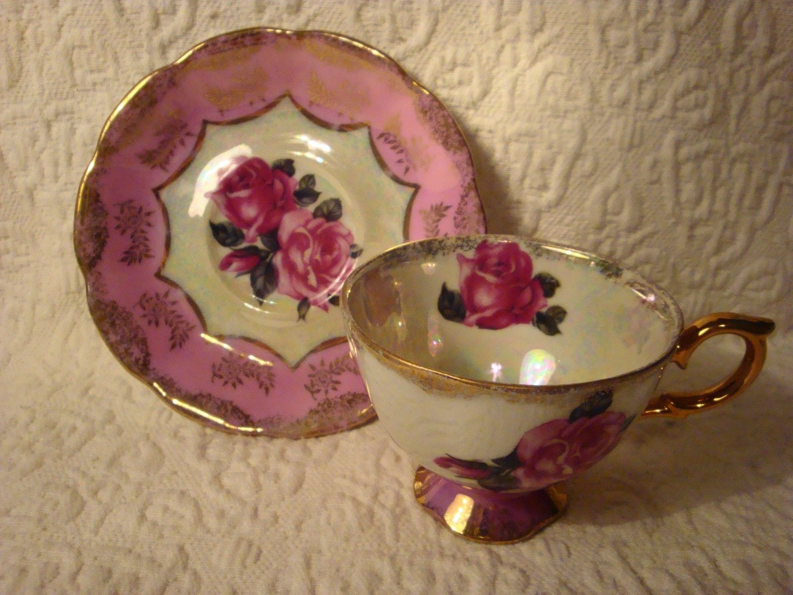 Title (ebay affiliate link): Vtg Bone China Tea Cup & Saucer Pink Iridescent Gold Trim & Pink Roses Unmarked
