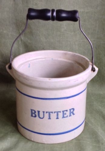 Antique Blue Decorated "Butter" Stoneware Crock w/Handle