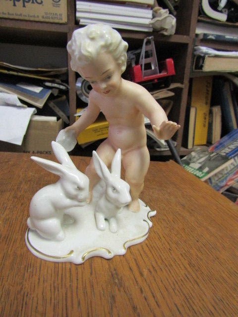 Antique Schaubach Kunst Boy W/Bunnies MINT Germany