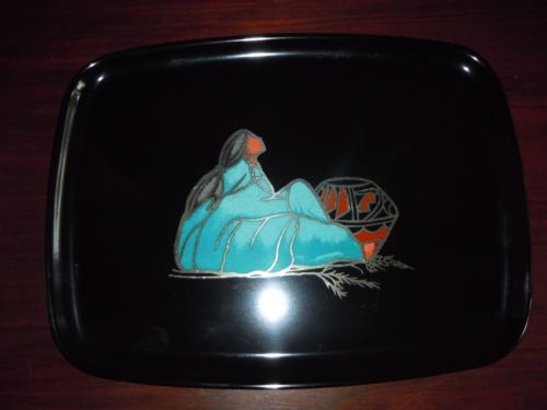 Title (ebay affiliate link): Couroc Of Monterey Native American Girl Inlaid Wood Brass Tray 13" Mid Century