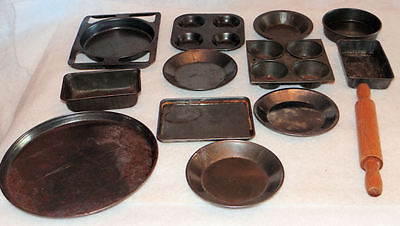 Title (ebay affiliate link): 13 Pc. Lot of Child's Aluminum Baking Dishes and one Wooden Rolling Pin.