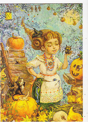 RARE Witch Halloween Cat owl pumpkins by Dudnik Russian modern postcard