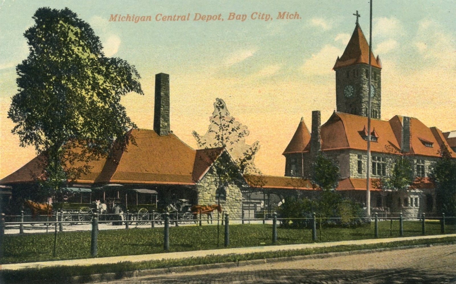 Bay City Michigan, pre 1910 postcard, Michigan Central Railroad Depot, buggies