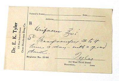 Title (ebay affiliate link): Vintage Prohibition Prescription Dr Tyler, Henderson Drug Co. Muscatine, Iowa