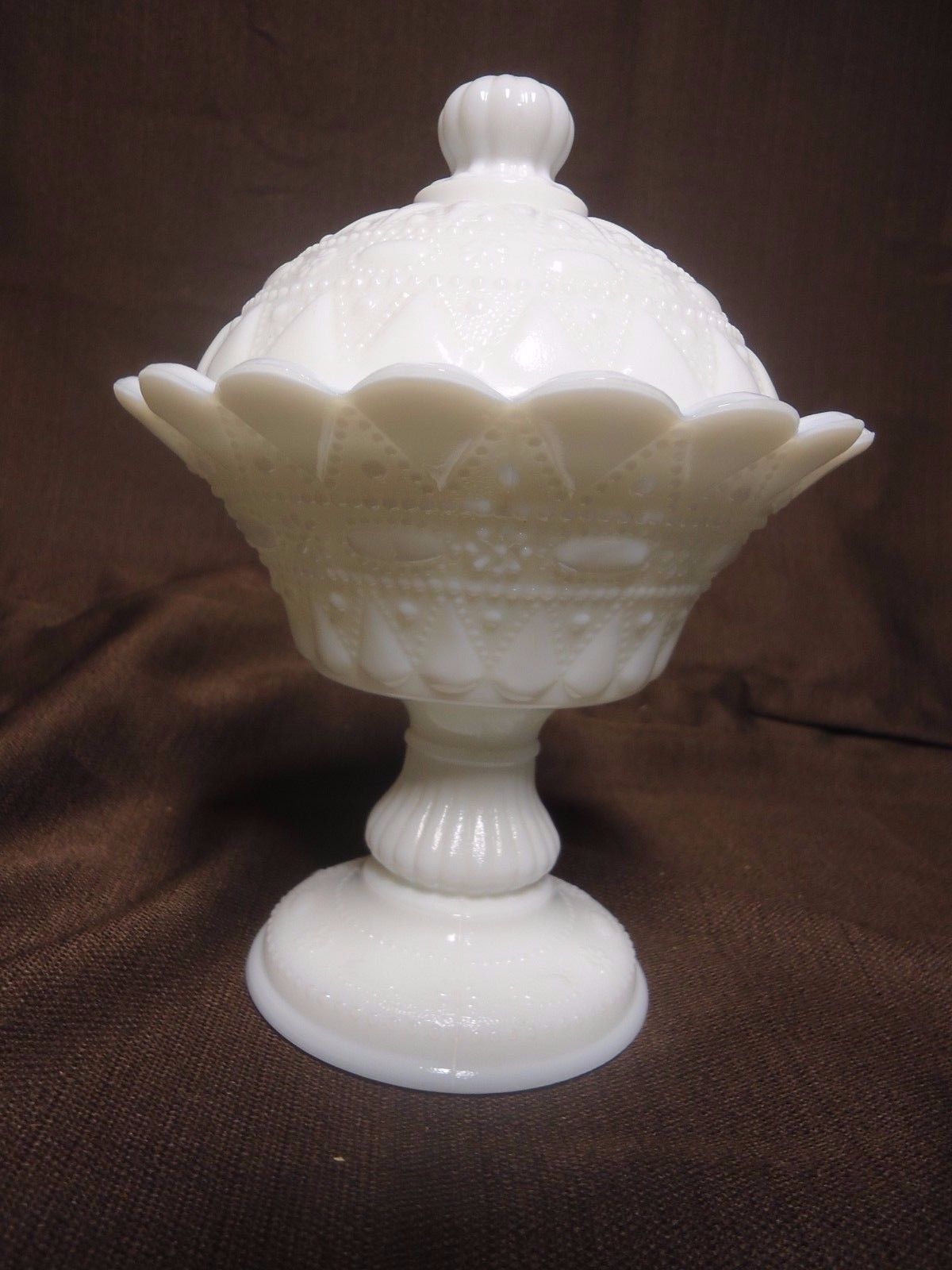 Title (ebay affiliate link): Vintage White Milk Glass Pedestal Candy Dish with Lid Raised Fruit Design MINT