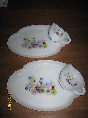 2 federal snack plates cups vintage milk glass Chalet House floral ex cond