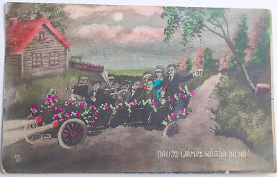 Antique Vintage postcard card Happy Name Day Old car 1927