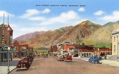 Brigham Utah, 40's linen postcard, cars, Roxy Theatre, MKN Furniture, Downtown