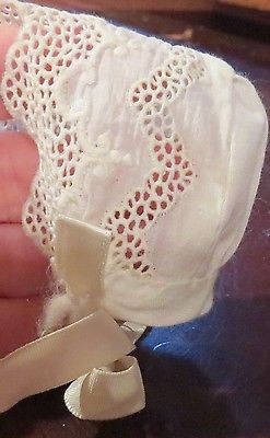 Title (ebay affiliate link): #32 Gorgeous Antique Hand Stitched Bonnet for Antique Bisque or Early Doll 7"