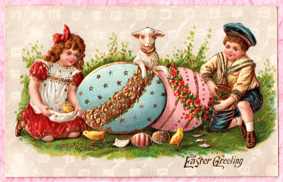 Title (ebay affiliate link): SUPER VIBRANT ~ KIDS & LAMB ~ DECORATE ORNATE GOLD EMBEL. EASTER EGGS 1910 PC