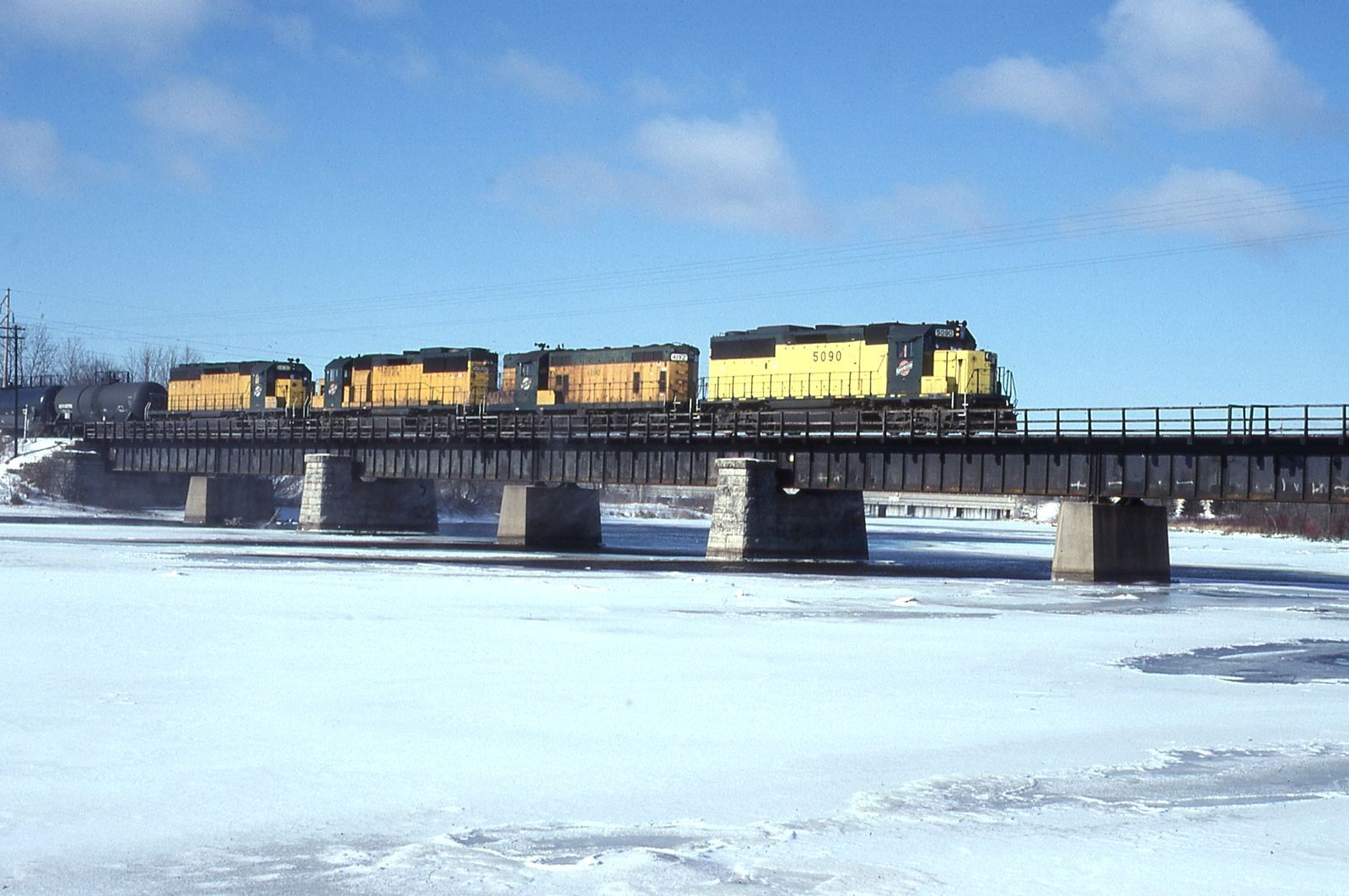 Title (ebay affiliate link): Chicago Northwestern GP50 # 5090 + 3 @ unknown location Winter 1995